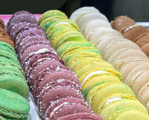 poudre d’amandes, blancs d’œufs, ganache mixte (pistache, chocolat, vanille…)